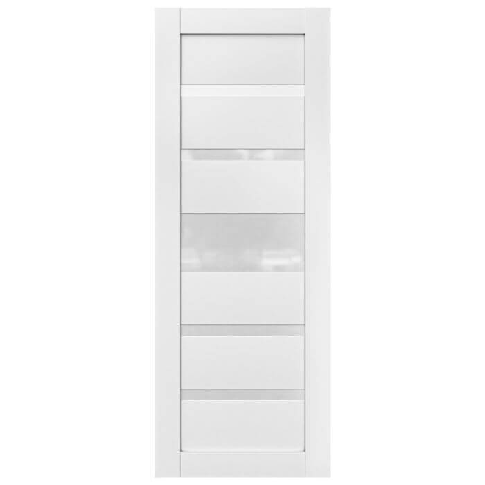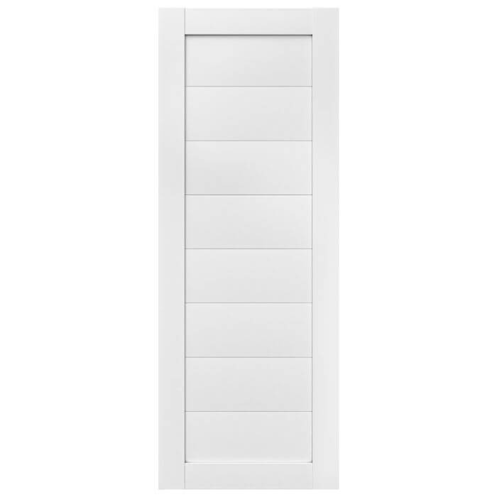 For interiors that embrace contemporary style with elegance, Martha is the right choice. This door features a white laminate finish and alternating horizontal polycarbonate solid glass panels, creating an elegant aesthetic. These translucent accents and subtle light play bring a visual interest to any space. On the other hand, the stile-and-rail pine core construction ensures the door is built to last, offering reliability. Whether installed as a single entrance, double swing, or conventional pocket door, Martha adapts seamlessly to your vision.